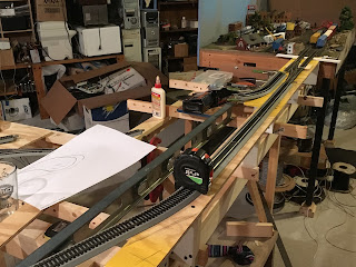 Lastly, I've resurrected the staging yard from the old layout I de-constructed last summer. At first I thought I would keep the turnouts as is, but the more I looked at it I determined that I'd prefer to make the yard functional from a switching perspective and not just a straight staging yard. So I ripped up the turnouts and have re-laid most of them and planned out the remainder.