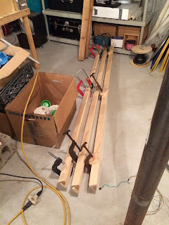 The end result? After $100 at the big Orange Store, as of tonight three girders are nailed, glued and drying (ran out of clamps) and the west end of the track plan has been fitted and tested (the beauty of snap track).